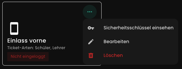 Ein Sicherheitsschlüssel für Ticket-Scans ist nach seiner Erstellung unbegrenzt gültig. Um einen Sicherheitsschlüssel zu löschen kann man im Abschnitt "Einlass" auf die 3 Punkte des Sicherheitsschlüssels klicken und daraufhin auf "Löschen". Danach ist der Sicherheitsschlüssel ungültig und wird im System gelöscht.