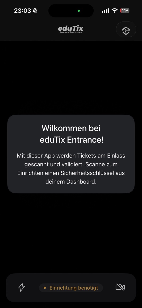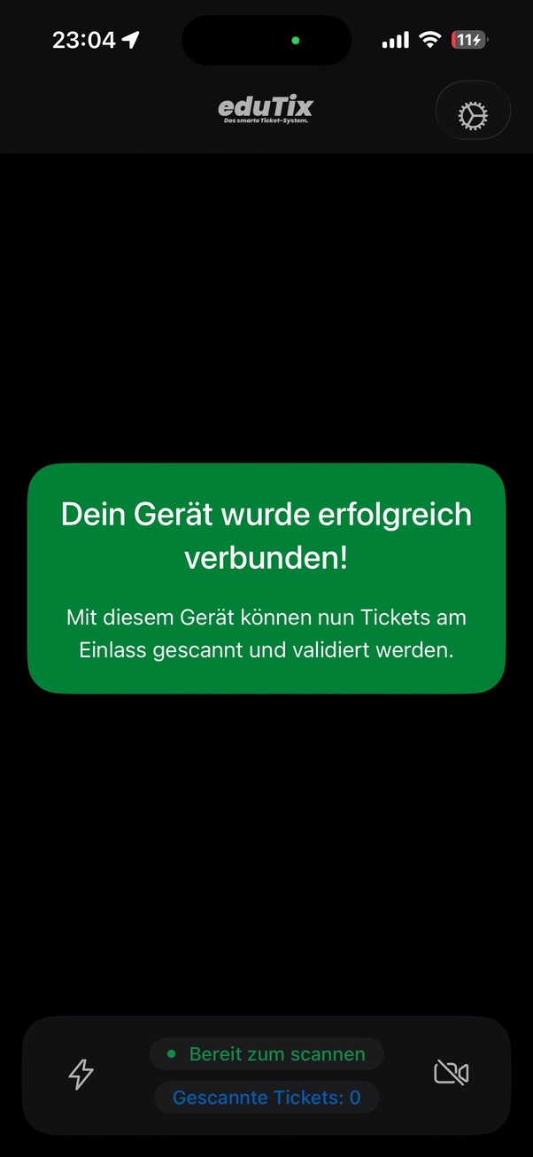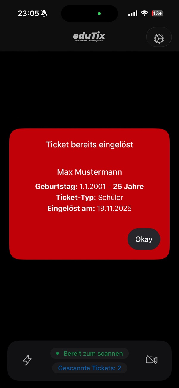 Nun können Tickets mit der im eduTix Dashboard für den Sicherheitsschlüssel eingestellten Ticket-Art von dieser Entrance App gescannt werden.